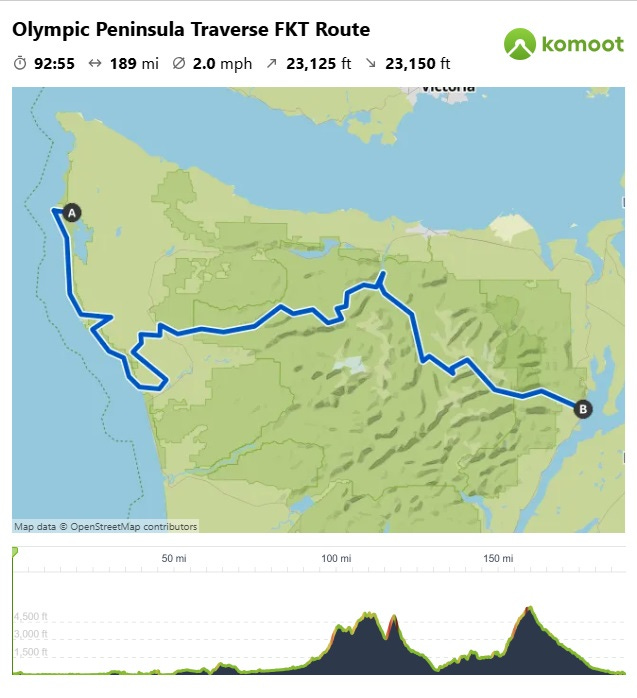 In a nutshell - 190ish miles on the Pacific Northwest Trail across the Olympic Peninsula of Washington State. Named an International Biosphere Reserve by UNESCO in 1976, the Olympic National Park is a biological wonder with ever changing landscapes. This route features technical challenges in the forms of coastal hazards, including tide pinch points only passable at certain tides, wet, barnacle covered rocks, numerous rope climbs, and decaying carcasses. Inland, unmaintained trail with heavy brush and blowdown, a burn section, three mountain passes and narrow, rocky trail provides more obstacles. It is a gorgeously scenic route that traverses coastal, rain forest and alpine ecosystems. Bears frequent the trails, so a bear canister for food is required for most of the route. A popular section of the Olympic National Park in the mid-section of the route also requires overnight permits for camping, requiring either careful planning to snag a mid-way spot or a very long day full of climbing to cross the restricted area before you stop to rest. We established the first women's time for this route in a total time of 6 days, 5 hours, 52 minutes and 30 seconds. We look forward to having more women follow in our footsteps, learn from us, and lower our time.