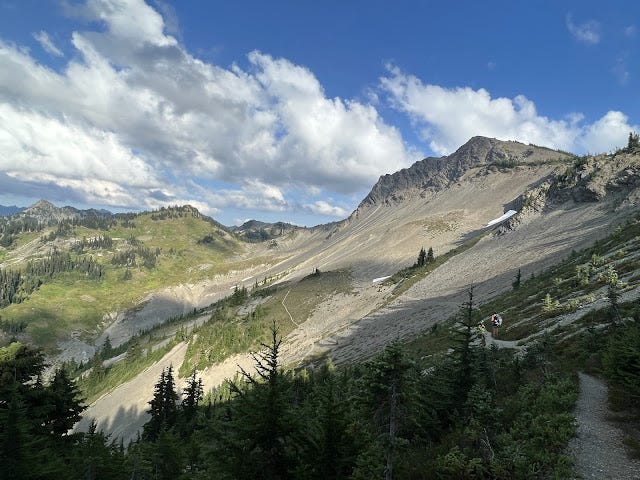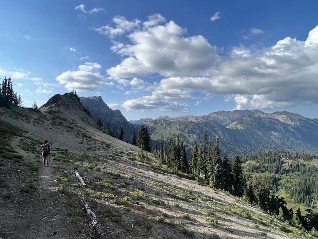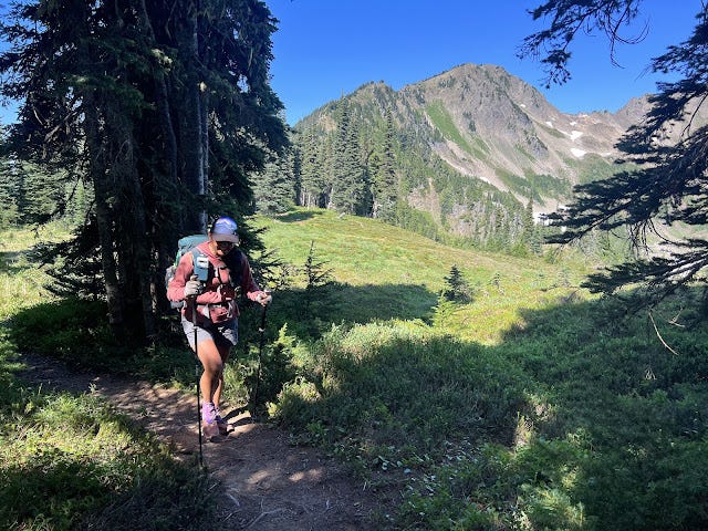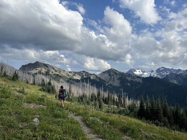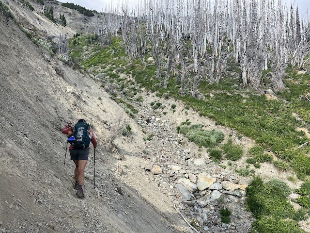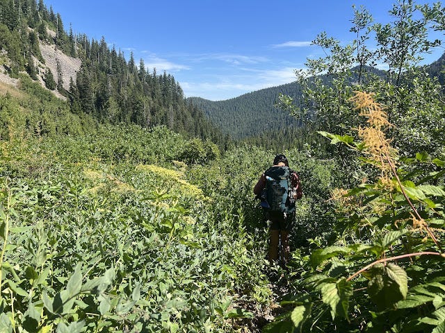 The Olympic National Park has had several fires over the years, and we found ourselves in one burned in 2016 because of lightning. We're used to burn sections; we work them on trail crew and they dot Oregon's forests. But burn sections are notoriously warm. Without tree cover to cool you, the temperatures intensify. And because of the burn, now six years old, trees come down regularly leading to lots of blowdown to be maneuvered. Marmots are thriving in this area too, which means making sure you aren't stepping into marmot holes and wrenching an ankle underneath the brush that is also growing quickly because it gets more sun. The climb was slow and tedious, and I was stopping to wet my shirt and/or my head at nearly all of the creeks we crossed. My feet were wet and unhappy; I could feel a painful blister between my wrapped up big toe and my second toe. I focused on getting to the pass and then being able to take a break.