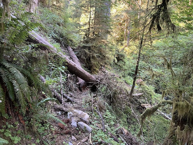 After a solid night's sleep, we were ready for the climb to Deer Lake. The Upper Bogachiel River Trail is gorgeous, with huge trees and mosses growing with reckless abandon. The trail climbs steadily towards the Little Divide Trail, but it has not seen a lot of maintenance. Crews are working on it this year, but once we got past Fifteen Mile Shelter, there were large piles of blowdown to contend with.
