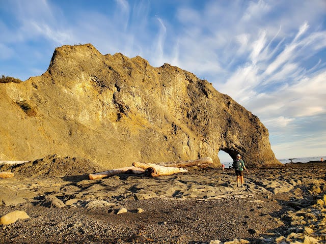 We woke early, leaving my daughter Kirsten sleeping in the cozy cabin at Lost Resort (a wonderful spot to stay or grab a burger) so that she would be rested for her drive home from dropping us off. Grabbing our packs which were light this day - we were doing a self-supported effort so we had left food in an RV we rented in La Push - we quickly walked the 1/2 mile to the Ozette Ranger Station where we would official start our journey. An extra half mile seemed so delightfully insignificant in the beginning...
