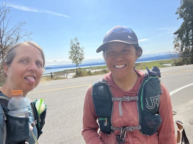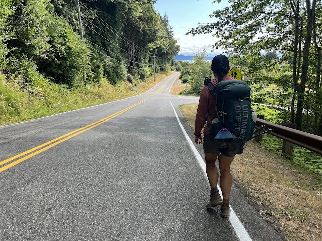 And then, miraculously, we could see Puget Sound. The end was actually near, and we walked in together, touching the 101 at 10:31 am, six days, five hours, and 52 minutes after leaving the Ozette Ranger Station. Stacey's partner met us with cold pizza and seltzer, the most delicious food after days of candy, mashed potatoes, corn nuts, Skratch and bars. Exhausted and proud, we peeled off our old clothes and finally put on something clean. My toe began throbbing, and during the ride home, I felt waves of pain run shock-like through me. Two days later I would be in urgent care, having my toe nail removed because of the infection that had developed from the blister under my nail.