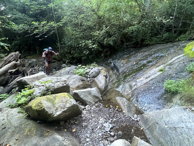I am terribly prone to overheating and sliding into heat illness. I also sweat a lot, which means dehydration is a constant concern. This FKT featured several days with hot afternoons during which I had to manage effort, cooling, fueling and hydration very carefully in order to not redline and get myself into trouble. Stopping to soak my shirt in the creeks, dumping water on my head, face and hands and keeping my effort steady and slow made this possible. Liquid calories helped with the fueling during the worst of the heat. I've finally had enough practice that I can get through these times with much less anxiety; I can recognize the symptoms for what they are and know that eventually things will feel better when the temperatures dropped. My feet were a constant concern because of the heat; between the sweat I was generating and the wetness of the creeks, they were chafing and developing blisters at a fairly rapid rate. I started changing out my socks to the driest ones I had after six to eight hours. Ideally I would take a 20 to 30 minute break with my feet out of the socks to dry out a bit and to bring down my core temperature, but this was not always possible. Sweating this much also meant that my shorts were constantly damp with sweat, which ended up causing one heck of a case of athlete's foot on my ass. At times a poking pain and other times crazy itching, this was a new phenomenon to deal with. I am not sure what might be done about this in future efforts, short of carrying additional gear to be able to wash and change them out regularly. Having to manage these challenges is frustrating, to say the least, but it is the reality of who I am physiologically. We can't change the cards we are dealt; all we can do is control how we play the hand.