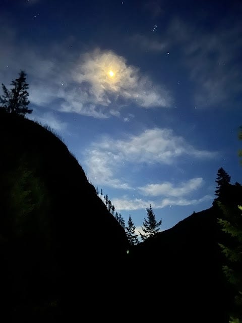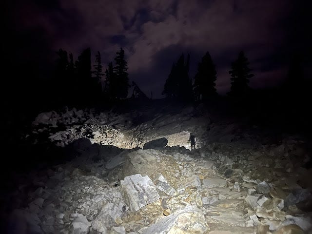 We climbed quietly through the dark. Large eyes looked back at Stacey, so I barked loudly like a dog. We ascended through the famously beautiful Seven Lakes Basin not able to see a thing.