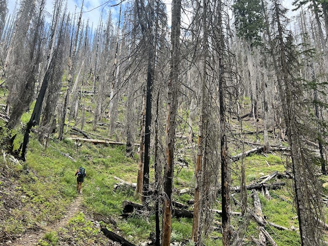 The first four miles climbed steadily through the forest and were in good condition. It was warm, so I was starting to stop and cool my head. And then we hit the fire zone.